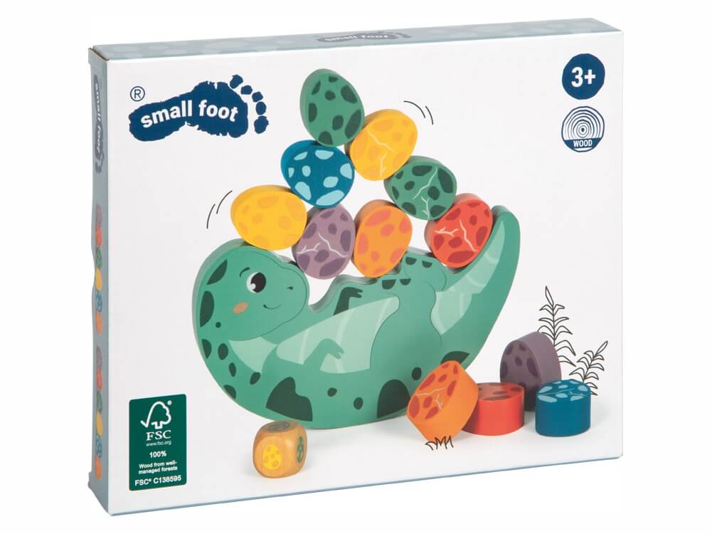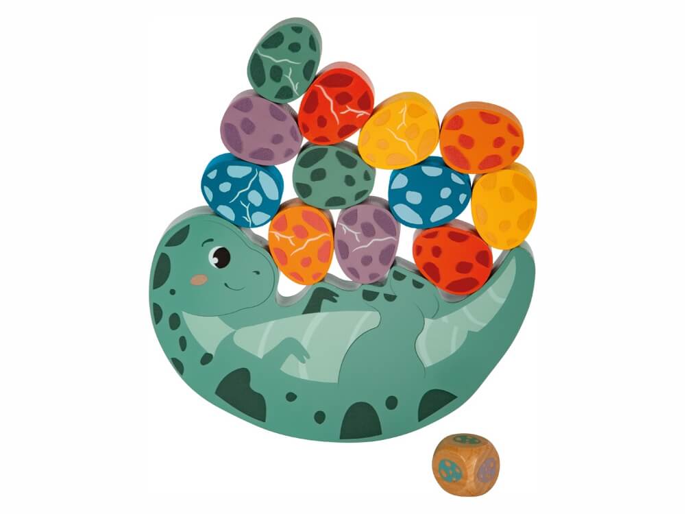 Lesena igra za učenje ravnotežja spodbuja potrpežljivost pri iskanju ravnotežja. Vrzite kocko in na ladjo položite jajce ustrezne barve ter poskrbite, da bo dinozaver v ravnotežju in se ne bo prevrnil.