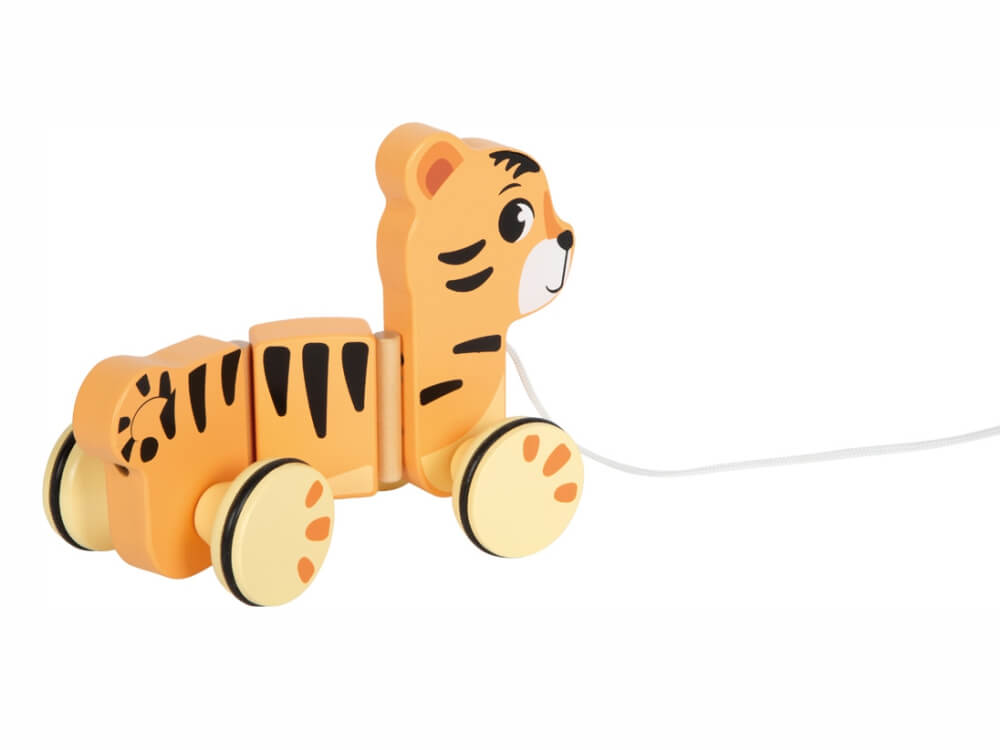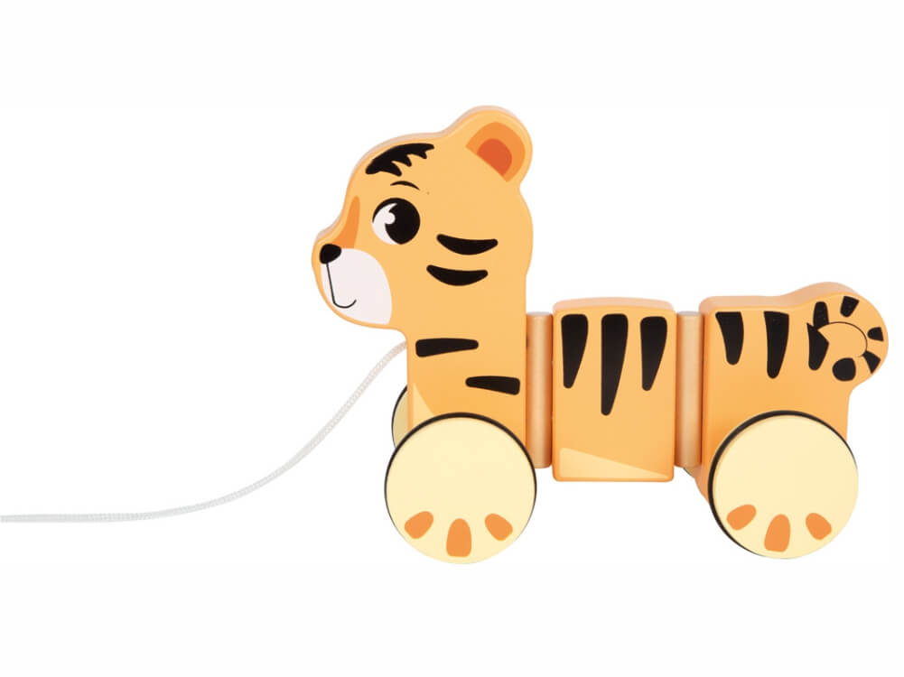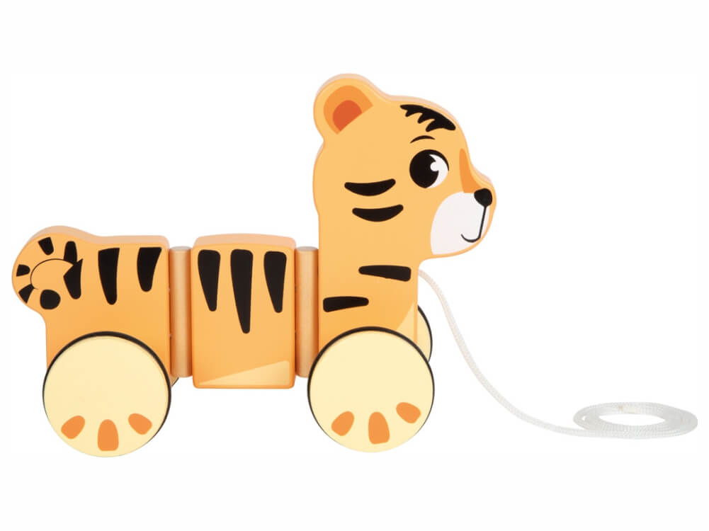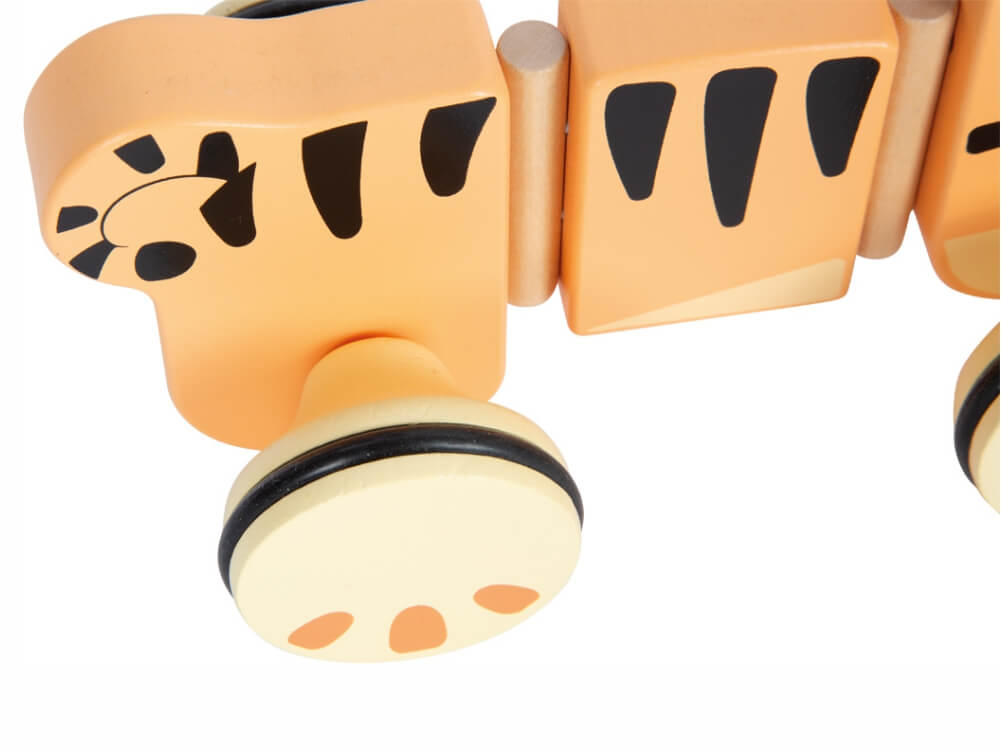 Lesena igrača za vlečenje tiger na vrvici je primerna za mlajše otroke. Otroci vlečejo igračo za seboj, ta pa se premika na lesenih kolesih in se zgiba.